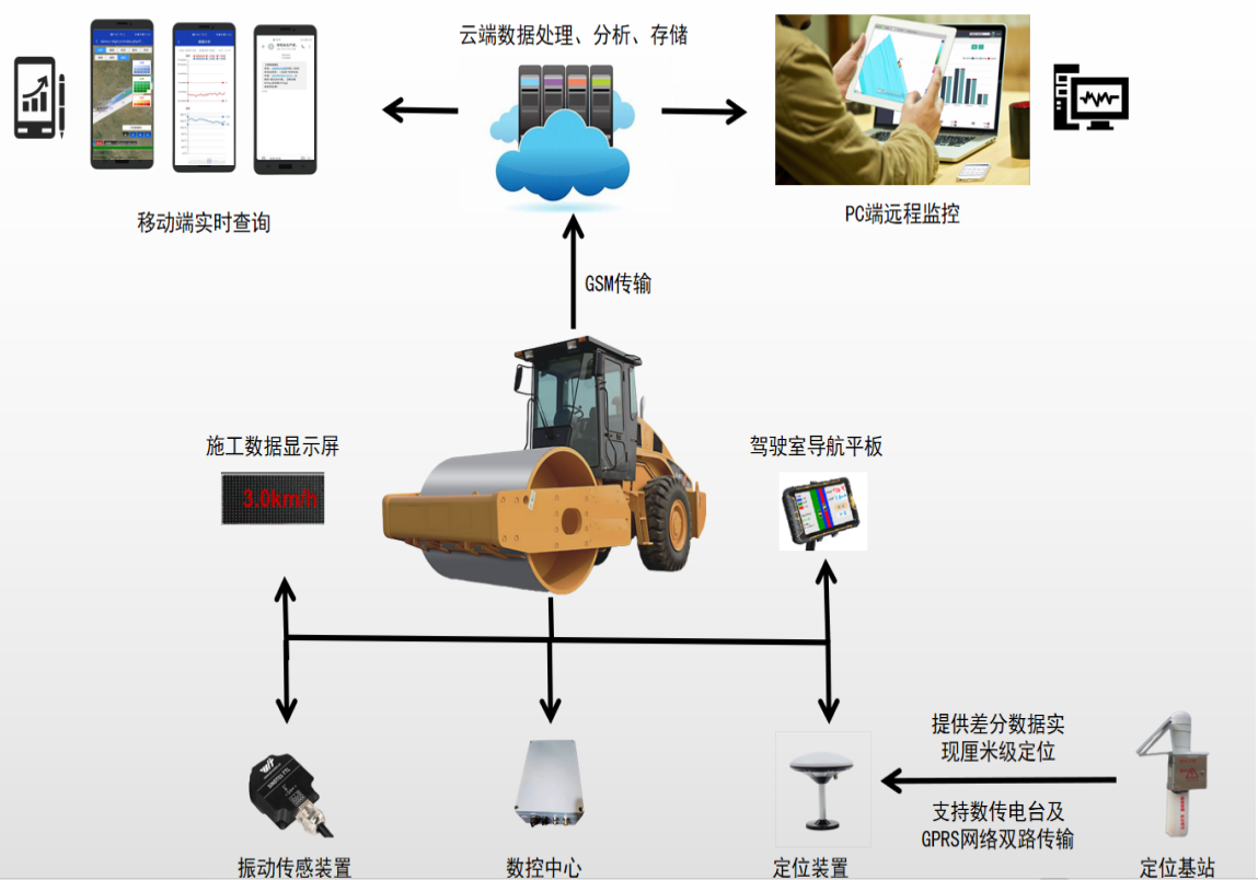 土方連續壓實智能管控系統 系統概述 通過實時連續壓實度值成像分析,實時指導機械操作人員,提高施工質量,對臺班成本、分部工程進度進一步把控;提供施工質量回溯手段;發現異常數據進行智能預警、實時糾偏;系統...